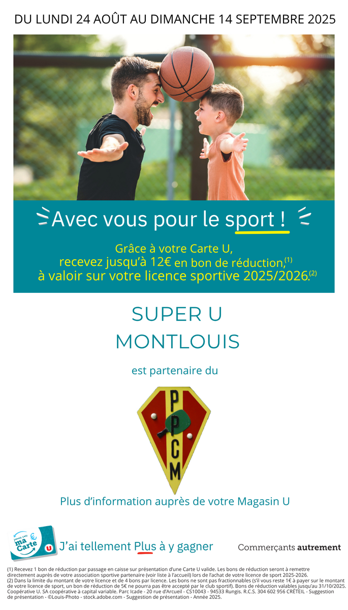 En convention avec le magasin Super U de Montlouis-sur-Loire il vous sera permis, à condition que vous ayez la carte U, d'avoir des réductions sur la cotisation du PPCM pour la saison 2025-26 :